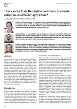 In this article, we discuss the ongoing Data Revolution in relation to climate action in agriculture. Data are highly relevant for climate action, as climate change makes current local knowledge increasingly irrelevant and requires smarter management of agricultural systems. We discuss five datarelated concepts and explore how they are linked with agricultural climate action: lean data, crowdsourcing, big data, ubiquitous computing, and information design. We show practical examples for each of these concepts. There are many opportunities for improving agricultural development projects, providing new services to smallholder farmers, and generating better information for policy- and decision-making. Making the Data Revolution work for smallholder farmers’ climate action not only takes further technological development, but also requires careful governance and public investment to avoid a few actors taking over the current innovation space and stifle further development.