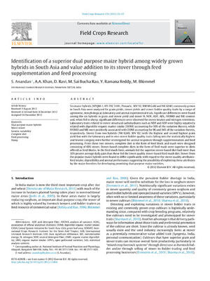 Anandan, S., Khan, A.A., Ravi, D., Sai Butcha Rao, M., Reddy, Y.R. and Blümmel, M. 2013. Identification of a superior dual purpose maize hybrid among widely grown hybrids in South Asia and value addition to its stover through feed supplementation and feed processing. Field Crops Research 153: 52-57.