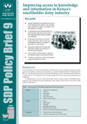 Smallholder Dairy Project (SDP). 2005. Improving access to knowledge and information in Kenya’s smallholder dairy industry. SDP Policy Brief 9. Nairobi, Kenya: Smallholder Dairy (R&D) Project.