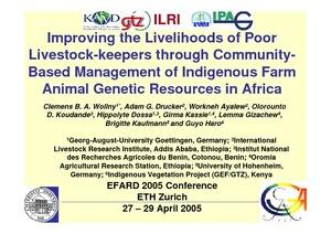 Wollny, C.B.A. et al. 2005. Improving the livelihoods of poor livestock keepers through community based management of indigenous farm animal genetic resources in Africa. IN: International Conference on Agricultural Research for Development: European Responses to Changing Global Needs, April 27-29, 2005. Nairobi: ILRI