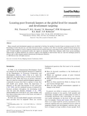 Thornton, P.K.; Kruska, R.L.; Henninger, N.; Kristjanson, P.M,; Reid, R.S.; Robinson, T.P. 2003. Locating poor livestock keepers at the global level for research and development targeting. Land Use Policy 20(4): 311-322.