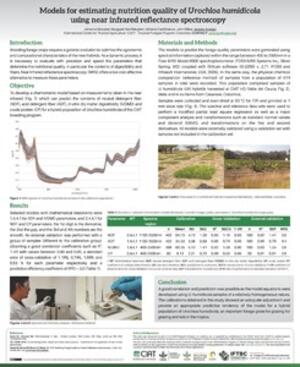 Mazabel J; Worthington M; Castiblanco V; Miles J; Arango J. 2019. Models for estimating nutrition quality of Urochloa humidicola using near infrared reflectance spectroscopy. In: International Forage & Turf Breeding Conference 24-27 March 2019, Lake Buena Vista, FL, USA. 1p.