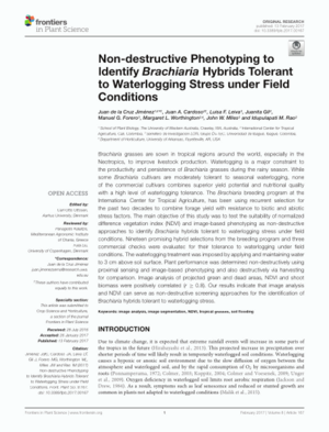 Jiménez, Juan de la Cruz; Cardoso, Juan A.; Leiva, Luisa F.; Gil, Juanita; Forero, Manuel G.; Worthington, Margaret L.; Miles, John W.; Rao, Idupulapati M.. 2016. Non-destructive phenotyping to identify brachiaria hybrids tolerant to waterlogging stress under field conditions . Frontiers in Plant Science 8: 167.