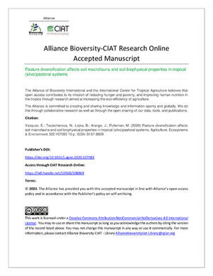 Vazquez, E.; Teutscherova, N.; Lojka, B.; Arango, J.; Pulleman, M. (2020) Pasture diversification affects soil macrofauna and soil biophysical properties in tropical (silvo)pastoral systems. Agriculture, Ecosystems & Environment 302:107083 10 p. ISSN: 0167-8809