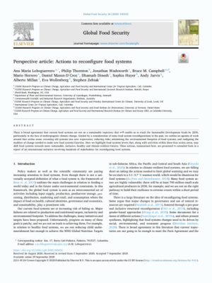 Loboguerrero, A.M.; Thornton, P.; Wadsworth, J.; Campbell, B.M.; Herrero, M.; Mason-D’Croz, D.; Dinesh, D.; Huyer, S.; Jarvis, A.; Millan, A.; Wollenberg, E.; Zebiak, S. (2020) Perspective article: Actions to reconfigure food systems. Global Food Security 26, 100432. ISSN: 2211-9124