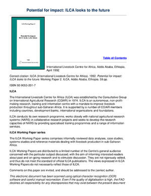 Presents papers discussing the potential for impacts within ILCA's organisational framework and mandate. The introductory paper raises general issues and poses questions that are pursued in the other papers. These papers address the environmental, economic and social components of impact within the organisation. Case studies on ILCA's research on tenure policy and alley farming, forage legumes, animal traction, milk processing, hay making and studies on pricing policies, technology generation and ILCA's research networks are presented in the papers.