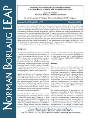 Coulibaly, J.; Balagtas, J.V.; Jabbar, M.; Negassa, A. 2008. Promoting participation of agricultural households in the milk market: evidence from northern Cote d’Ivoire. Research Brief S06-08-10-LEAP. Davis, C.A. (USA): Norman E. Borlaug Leadership Enhancement in Agriculture Program
