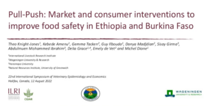Knight-Jones, T., Amenu, K., Tacken, G., Ilboudo, G., Madjdian, D., Girma, S., Ibrahim, A.M., Grace, D., Vet, E. de and Dione, M. 2022. Pull-Push: Market and consumer interventions to improve food safety in Ethiopia and Burkina Faso. Oral presentation at the 16th International Symposium of Veterinary Epidemiology and Economics, Halifax, Canada, 12 August 2022. Nairobi, Kenya: ILRI.