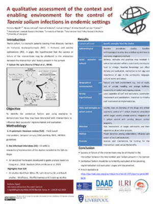 Ngwili, N., Johnson, N., Wahome, R., Githigia, S., Roesel, K. and Thomas, L. 2021. A qualitative assessment of the context and enabling environment for the control of Taenia solium infections in endemic settings. Poster prepared for Tropentag 2021 - Towards shifting paradigms in agriculture for a healthy and sustainable future, 15-17 September 2021. Nairobi, Kenya: ILRI.