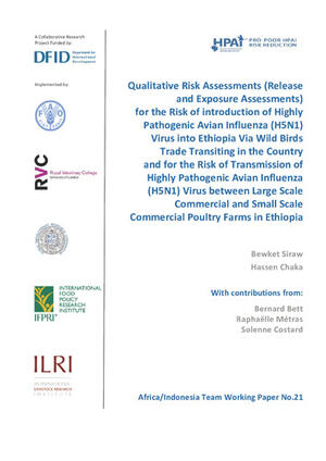 Siraw, B., Chaka, H., Bett, B., Métras, R. and Costard, S. 2009. Qualitative risk assessments (release and exposure assessments) for the risk of introduction of highly pathogenic avian influenza (H5N1) virus into Ethiopia via wild birds trade transiting in the country and for the risk of transmission of highly pathogenic avian influenza (H5N1) virus between large scale commercial and small scale commercial poultry farms in Ethiopia. HPAI Africa/Indonesia Team Working Paper 21 Washington DC: IFPRI. https://hdl.handle.net/10568/487
