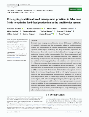 Bezabih, M., Mekonnen, K., Adie, A., Tadesse, T., Nurfeta, A., Dubale, W., Habiso, T., Kelkay, T.Z., Getnet, M., Ergano, K., Duncan, A.J. and Thorne, P. 2022. Redesigning traditional weed management practices in faba bean fields to optimize food-feed production in the smallholder system. Agronomy Journal 114(1): 248-258.