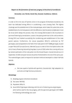 Hernández LM; Florián D; Rios G; Castiblanco V. 2019. Report on the formation of testcross progeny in Brachiaria humidicola. International Center for Tropical Agriculture, Cali, Colombia. 5p.