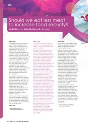 Hird, V. and J.J. McDermott. 2010. Should we eat less meat to increase food security? People and Science. (June): 10-11.