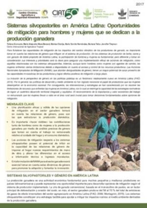 Gumucio T, Mora Benard MA, Clavijo M, Hernández MC, Tafur M, Twyman J. 2017. Sistemas silvopastoriles en América Latina: Oportunidades de mitigación para hombres y mujeres que se dedican a la producción ganadera. CCAFS Policy Brief. Wageningen, the Netherlands: CGIAR Research Program on Climate Change, Agriculture and Food Security (CCAFS).
