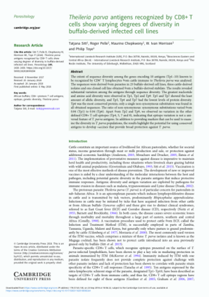 Sitt, T., Pelle, R., Chepkwony, M., Morrison, W.I. and Toye, P. 2018. Theileria parva antigens recognized by CD8+ T cells show varying degrees of diversity in buffalo-derived infected cell lines. Parasitology 145(11):1430-1439.