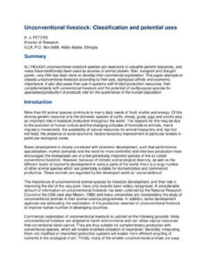 Classifies unconventional livestock according to size, ecological affinity and economic importance and discusses their use in systems with limited production resources, their complementarity with conventional livestock, and the potential of multipurpose species for specialized production of products vital for the sustenance of the human population.