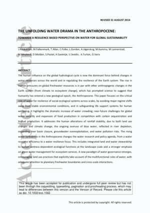 Rockström, J., Falkenmark, M., Allan, T., Folke, C., Gordon, L., Jägerskog, A., Kummu, M., Lannerstad, M., Meybeck, M., Molden, D., Postel, S., Savenije, H., Svedin, U., Turton, A. and Varis, O. 2014. The unfolding water drama in the Anthropocene: Towards resilience based perspective on water for global sustainability. Ecohydrology 7(5):1249-1261.