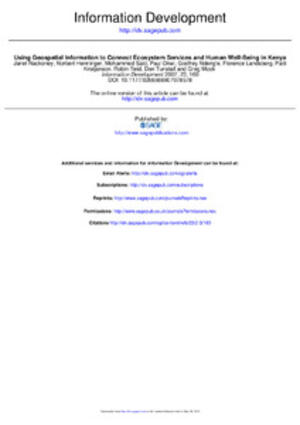Nackoney, J.; Henninger, N.; Said, M.; Okwi, P.O.; Ndeng'e, G.; Landsberg, F.; Kristjanson, P.; Reid, R.S.; Tunstall, D.; Mock, G. 2007. Using geospatial information to connect ecosystem services and human well-being in Kenya. Information Development 23(2/3):160-182.