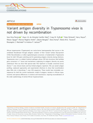 Pereira, S.S., Neto, K.J.G.A.C., Duffy, C.W., Richards, P., Noyes, H., Ogugo, M., André, M.R., Bengaly, Z., Kemp, S., Teixeira, M.M.G., Machado, R.Z. and Jackson, A.P. 2020. Variant antigen diversity in Trypanosoma vivax is not driven by recombination. Nature Communications 11:844.