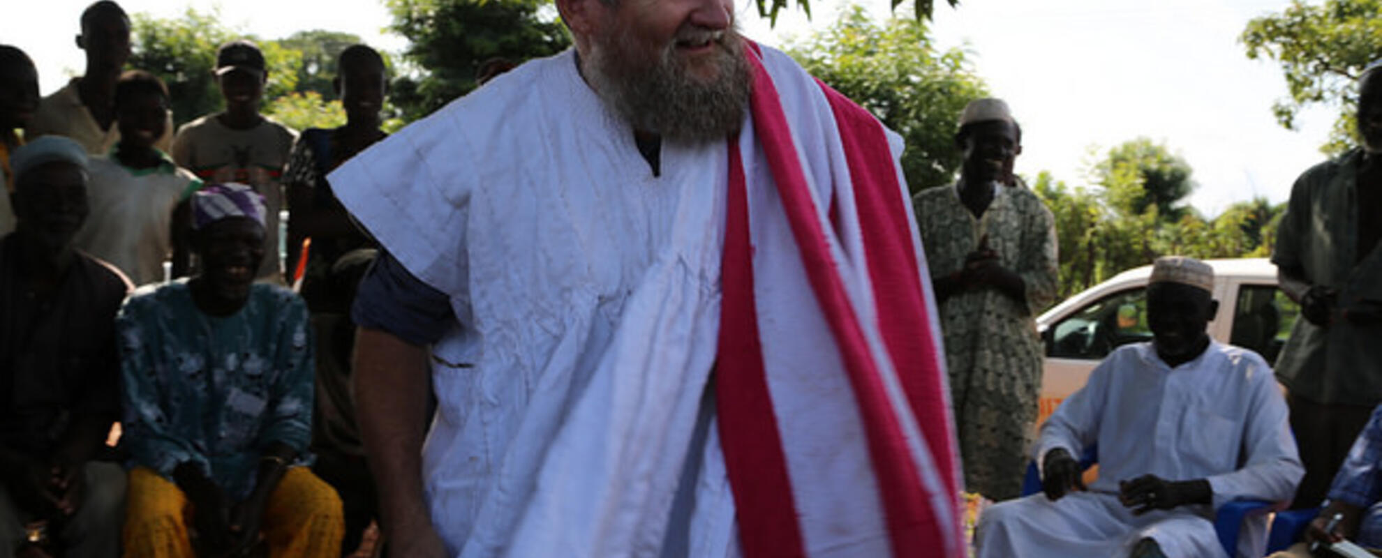 Farmers in Cheyohi no. 2 Community in the Northern Region of Ghana ceremonially dressed Jerry Glover in the traditional Ghanaian smock as a sign of their appreciation to USAID and Africa RISING (photo credit: Jonathan Odhong/IITA).