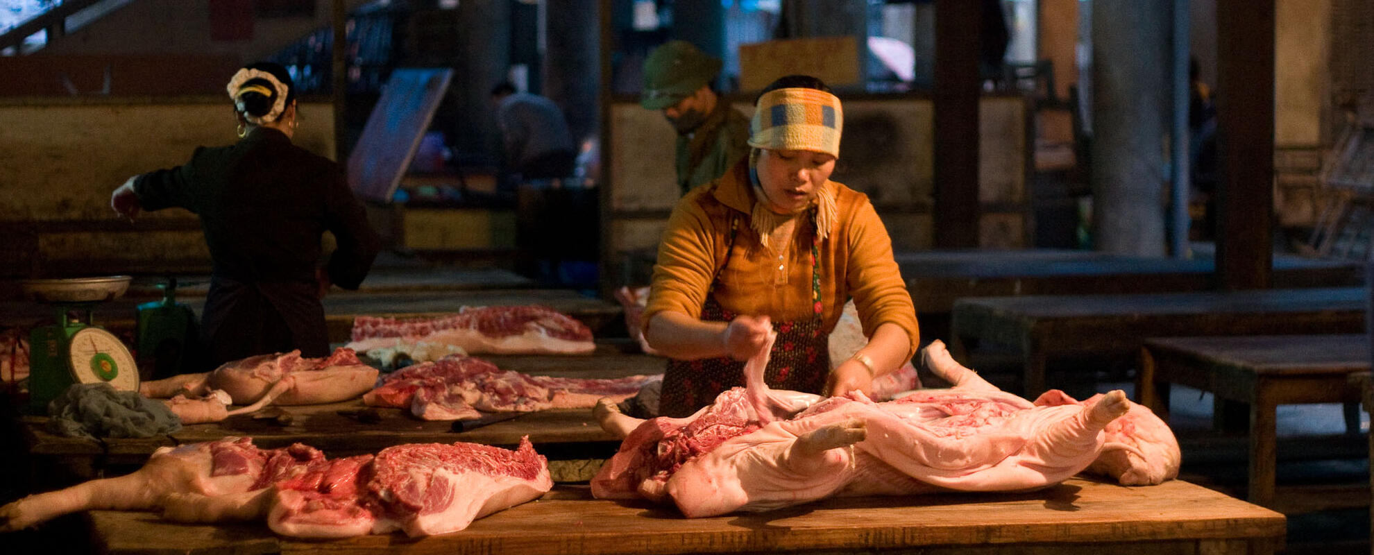 At the Sunday market in Sapa, northern Vietnam, women butcher hogs slaughtered outside of town but still steaming when they start working on them at the market (image via Flickr/Kurt Johnson).