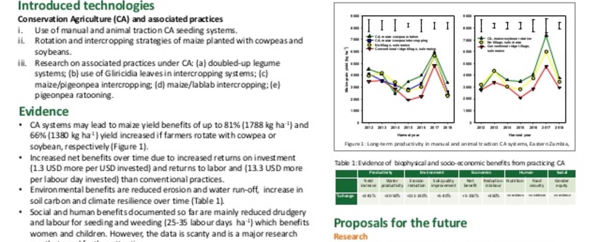 This poster presents research evidence from eastern Zambia that shows that CA systems may lead to maize yield benefits of up to 81% (1,788 kg ha-1) and 66% (1,380 kg ha-1) if farmers rotate with cowpea or soybean, respectively. Increased net benefits (5-150%) have been recorded over time due to increased returns on investment (USD 1.3 more per USD invested) and returns on labour (USD 13.3 more per labour day invested) than conventional practices. Other regional research results published in numerous papers show that environmental benefits of CA are increased water infiltration, greater soil moisture content, reduced erosion and water run-off, increase in soil carbon and climate resilience over time. Other more social benefits are reduced labour for seeding and weeding (25-35 labour days ha-1) which preferentially benefits women and children.